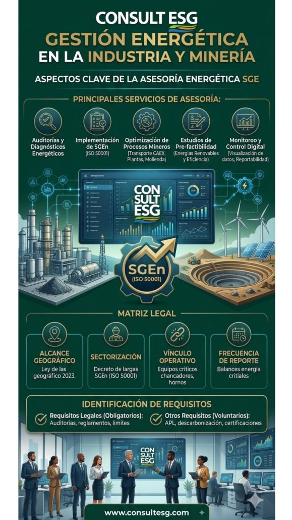 • Sistemas de Gestión de Energía (SGE): Implementación de marcos de trabajo (ISO 50001) que permiten la mejora continua del desempeño energético, estableciendo líneas base y metas verificables.