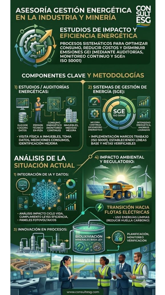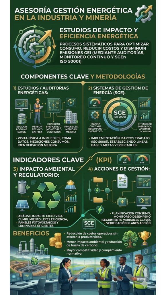 Los estudios de impacto y gestión de la eficiencia energética son procesos sistemáticos para optimizar el consumo de recursos, reducir costos y disminuir las emisiones de gases de efecto invernadero (GEI) mediante auditorías, monitoreo continuo y la implementación de sistemas de gestión (como la norma ISO 50001).