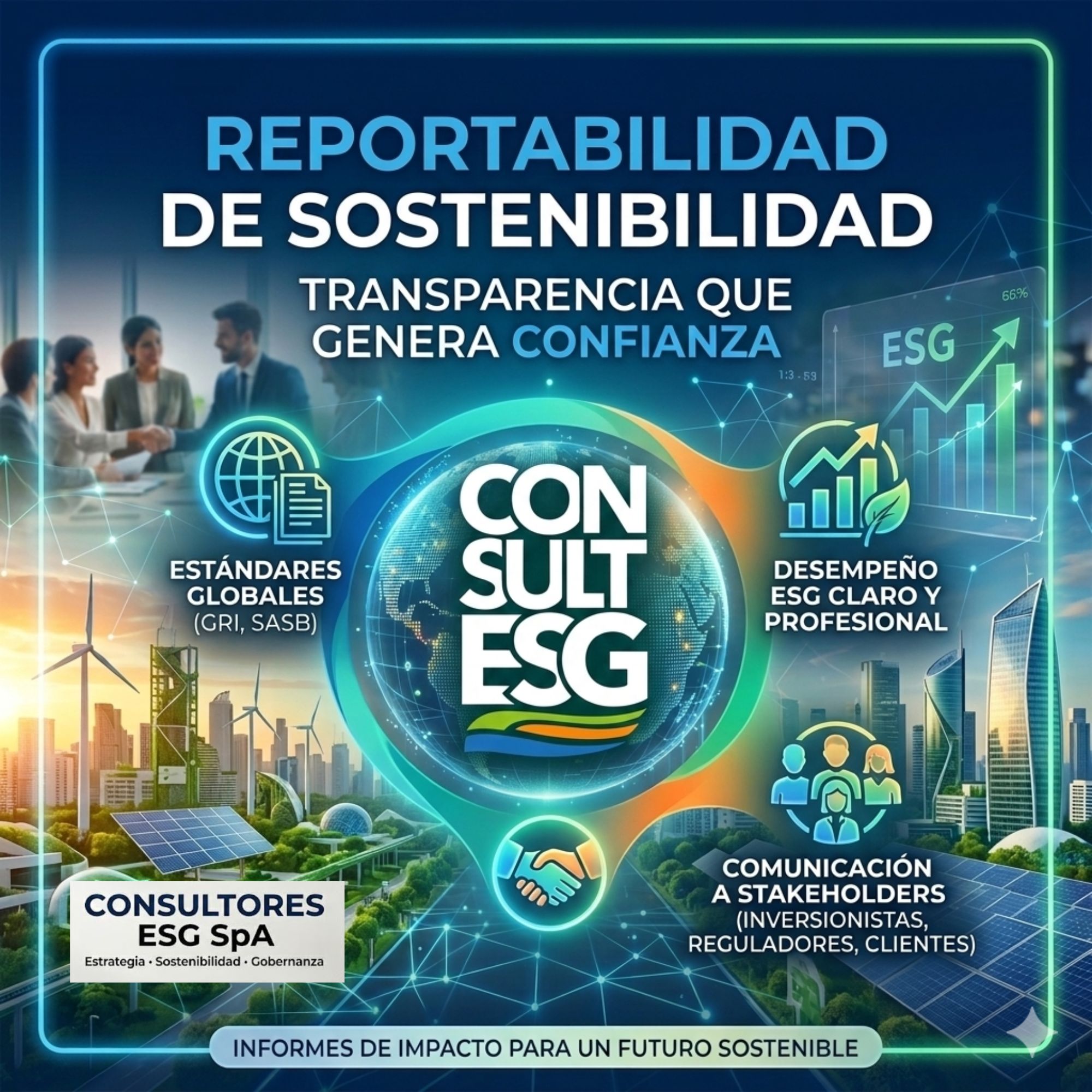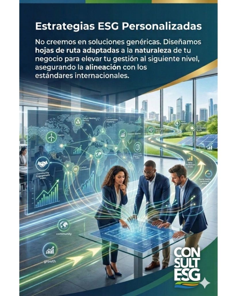 «¿Consultores ESG SpA, lista para el futuro de los negocios? El éxito hoy no solo se mide en rentabilidad, sino en impacto. En nuestro equipo integramos asesorías ESG personalizadas para llevar tu gestión al siguiente nivel: desde la medición de huella de carbono y estudios de impacto ambiental, hasta una reportabilidad de sostenibilidad sólida y transparente. ¡Hagamos que la sostenibilidad sea tu mayor ventaja competitiva!»