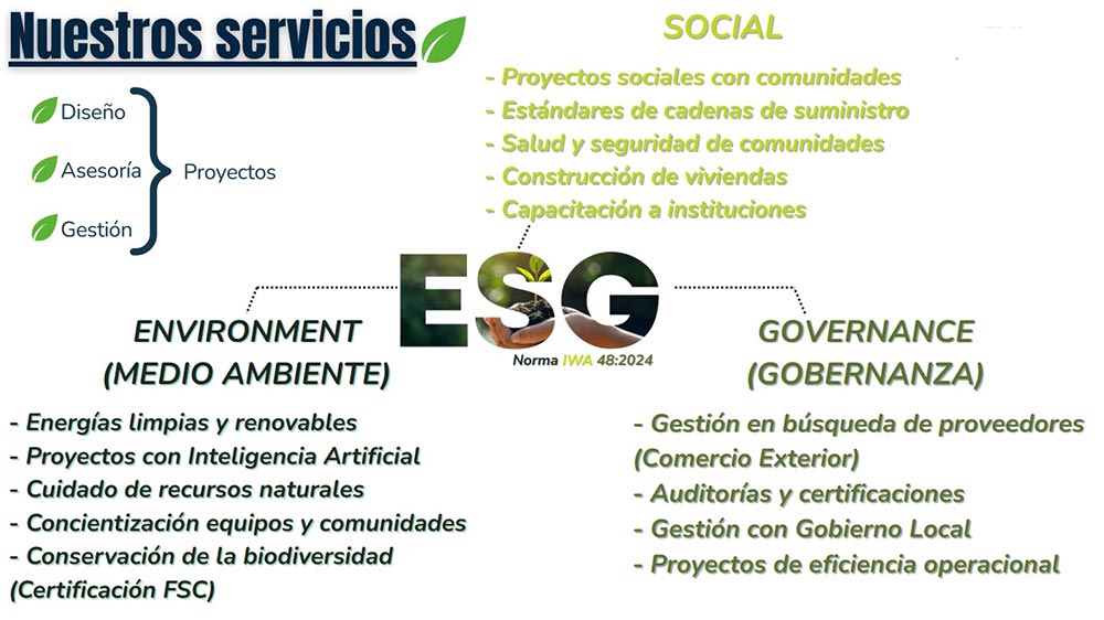 Asesoría y desarrollo de competencias en colaboración estrecha con nuestros clientes, brindando soluciones en áreas clave como excelencia operacional, gestión ESG (Ambiental, Social, Gobernanza), gestión de calidad, gestión ambiental, gestión energética, gestión de activos, seguridad y salud en el trabajo, higiene industrial, eficiencia energética, entre otras. Nuestro compromiso es satisfacer las necesidades de cada cliente a través de un servicio de excelencia, generando valor y resultados concretos.